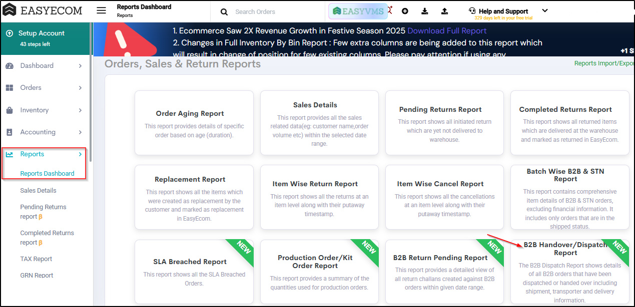 The B2B Handover / Dispatch Report provides details of all B2B orders that have been shipped or handed over, including shipment, transporter, and delivery information captured during the handover / manifest process.
