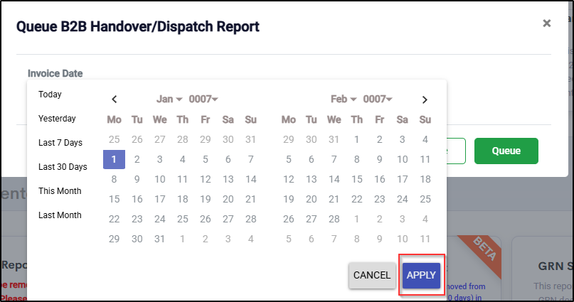 Step 3: Select Invoice Date range, as per your requirement and Click Apply