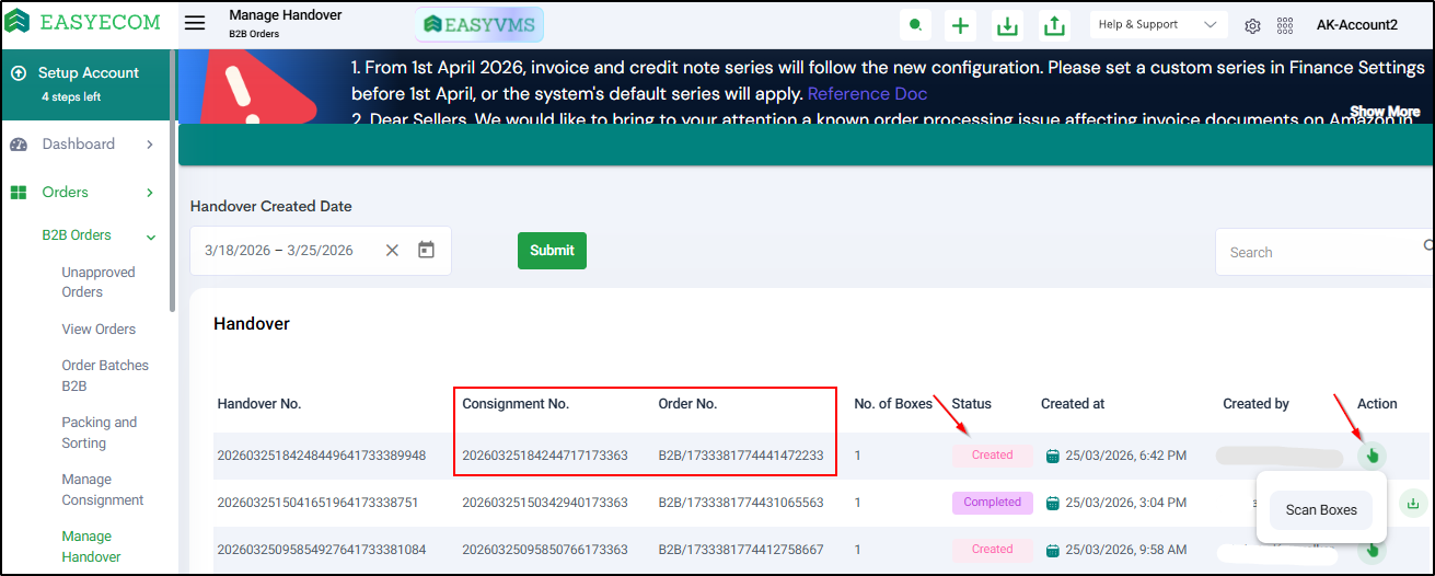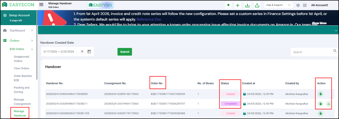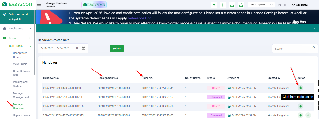 Go to: Orders → B2B Orders → Manage Handover