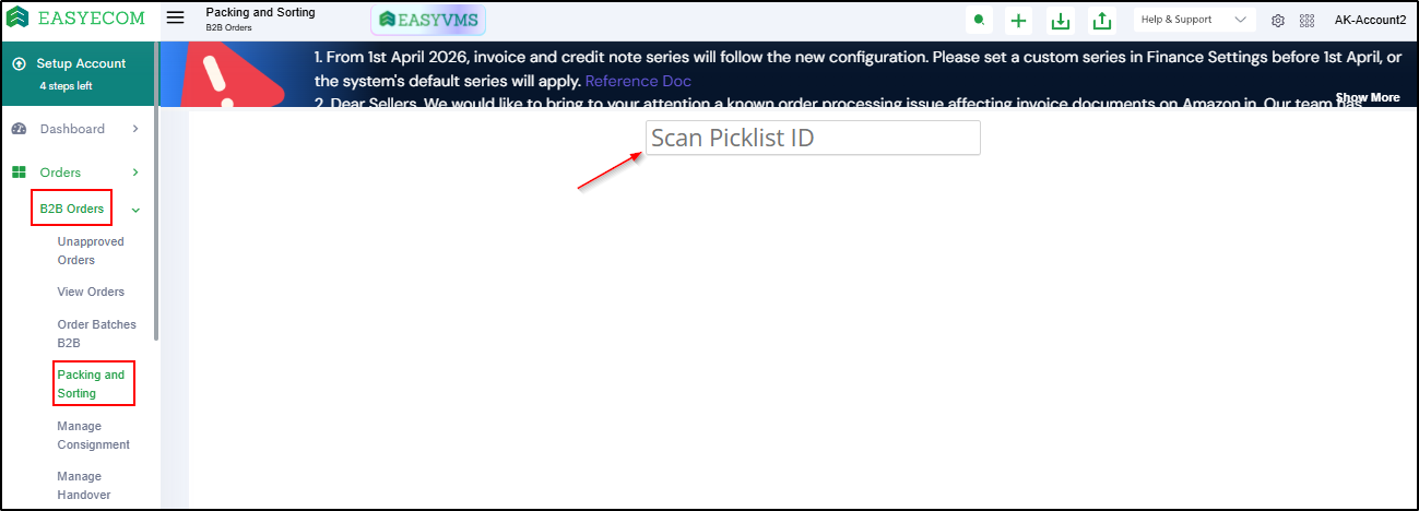 Navigate to 'B2B Orders > Packing and Sorting' and scan the Picklist ID