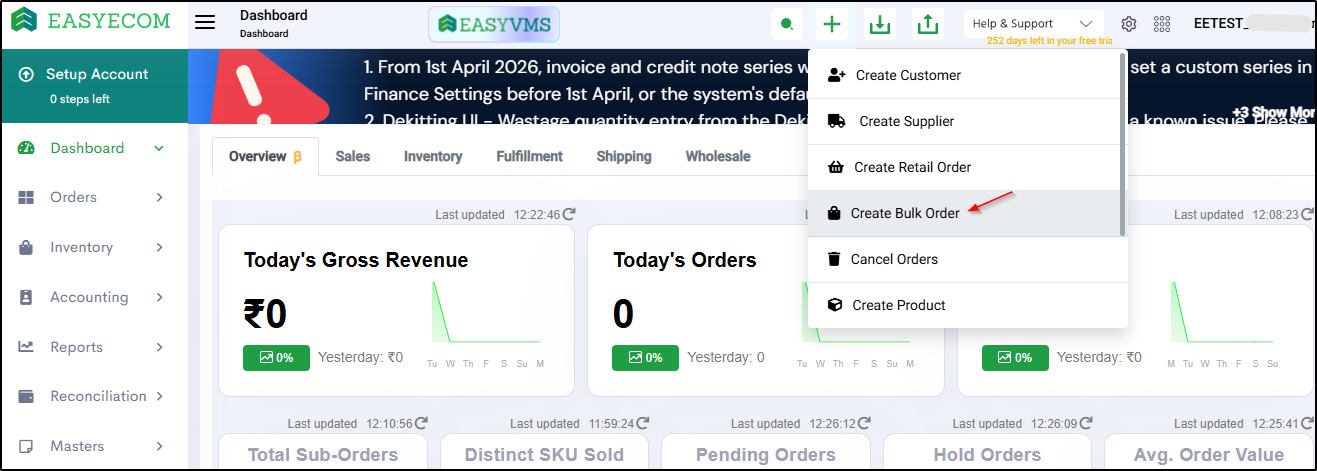 Step 1: Go to (+) icon and Click on 'Create Bulk Order'