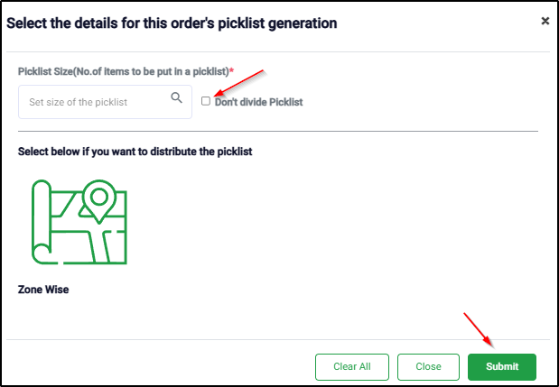 - If you wish to divide the picklist into multiple picklists, keep the box unchecked and choose the zone to divide the picklist as per the zone and click on Submit