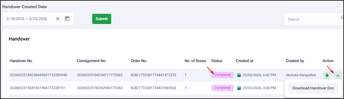 Manifest will be completed and Handover doc can be downloaded from Download button on the handover page