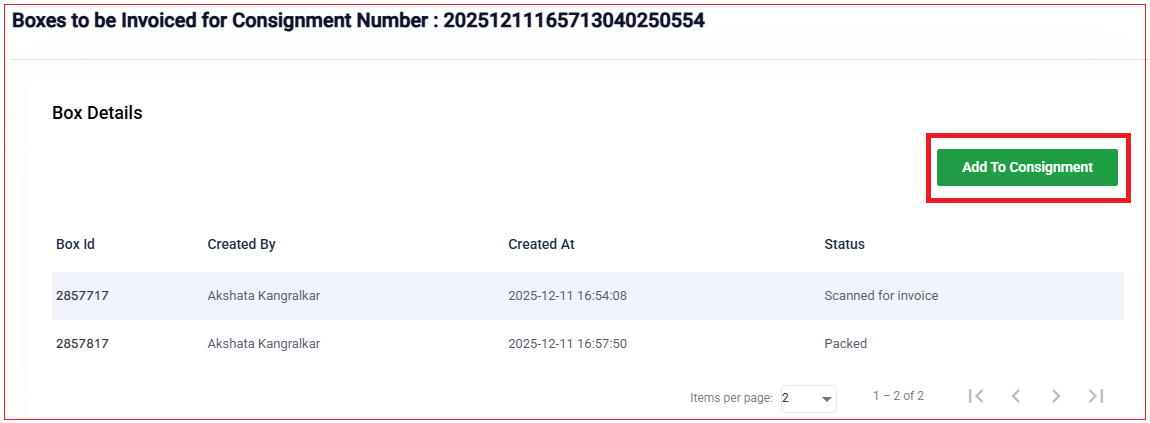 If Skip Box Scanning During Invoicing is enabled, then after scanning the first box, click on View All Boxes. This will display all closed boxes associated with the order. Clicking Add To Consignment will add all closed boxes to the consignment at once.