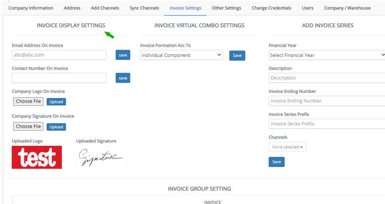 For the company logo and signature which needs to be printed on the invoice please click on the “Choose File” option first and select the logo/signature from your system. Then click on the “Upload” button.