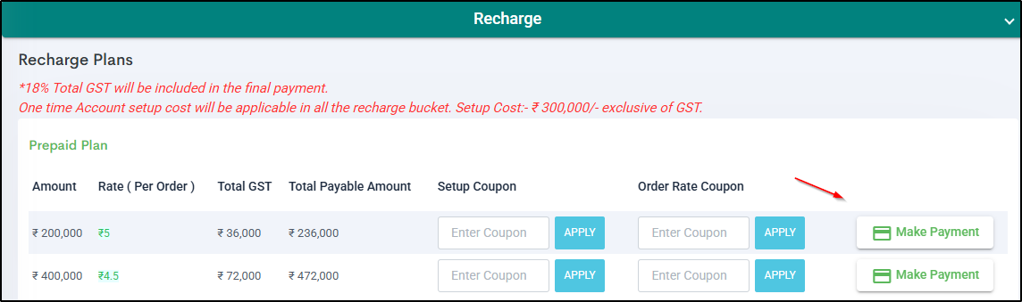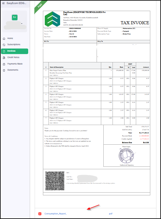 Example: If ₹1,00,000 is paid in advance and the monthly invoice is ₹20,000, the available credits will reduce to ₹80,000.