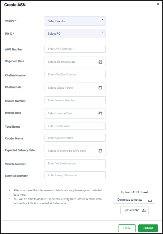 Once the sheet is successfully uploaded, the ASN status will be changed to "In Transit".