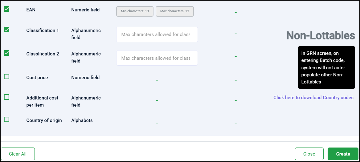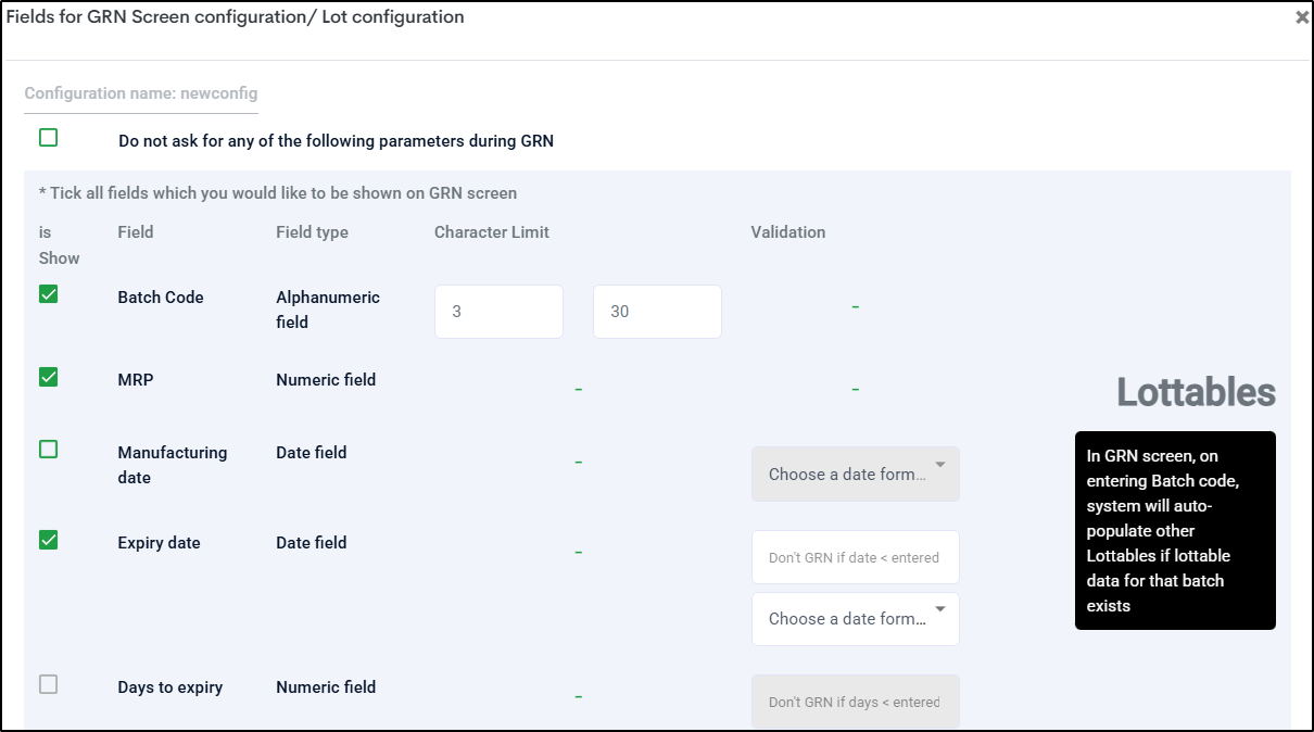 Once the GRN screen is configured, the lottable fields become non-editable. However, it is still possible to edit the character limit and validations. On the other hand, non-lottable fields remain editable and can be un-selected even after the configuration is completed.