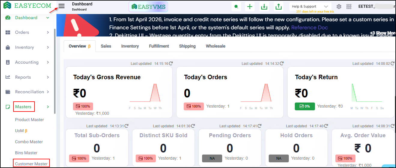 Step 1: Go to Masters (main menu) > Customer Master.