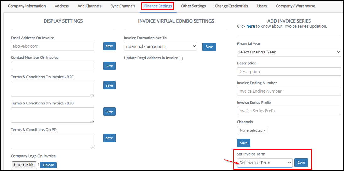 Settings → Finance Settings → Set Invoice Term