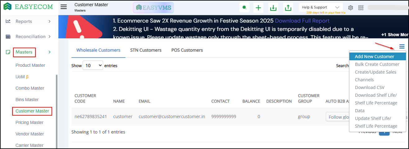 Navigate to Masters > Customer Master > Click on (☰) Hamburger Menu > Add New Customer