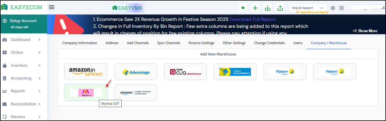 On the Account Settings page, go to Company/Warehouse and Click on Myntra SJIT