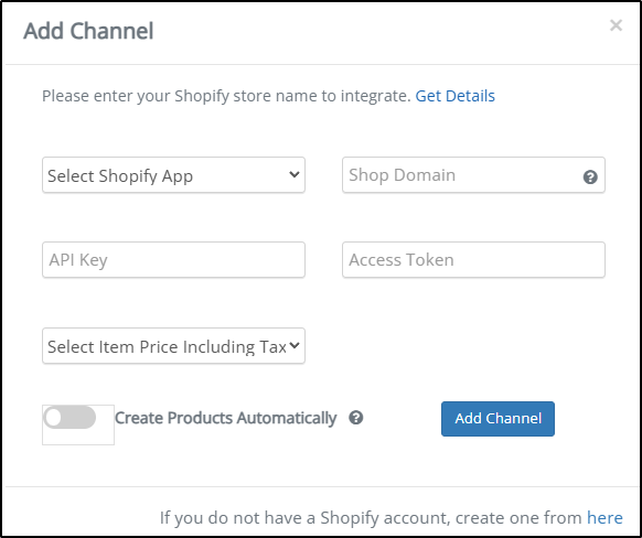 The following fields are available on the Shopify channel setup screen:
