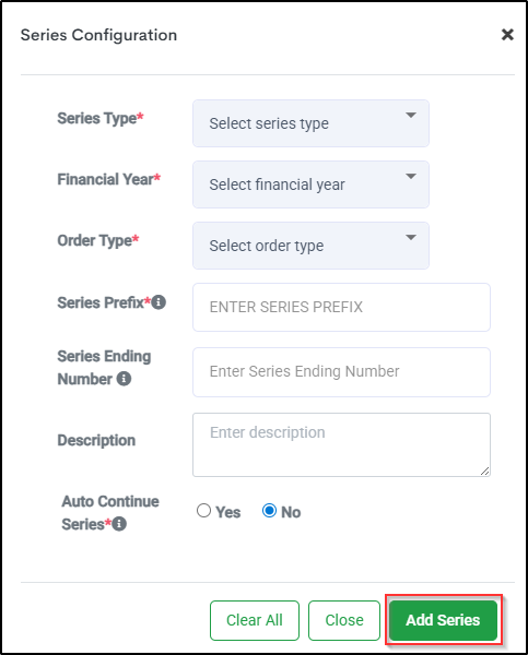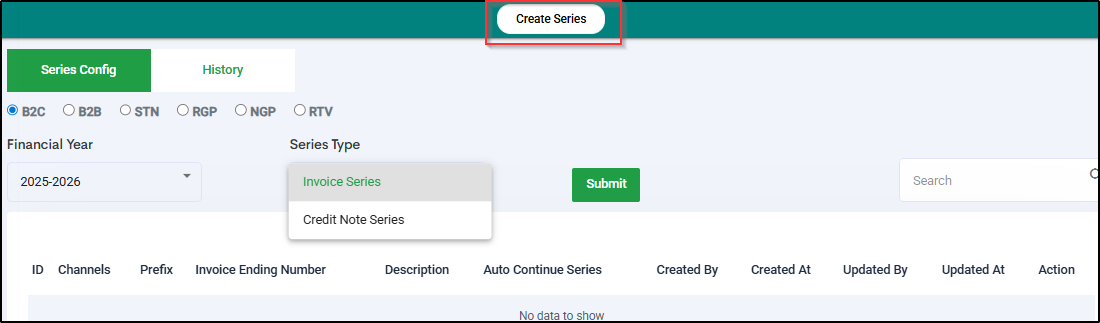 - Select Series Type (Invoice, Credit Note or Return Challan)