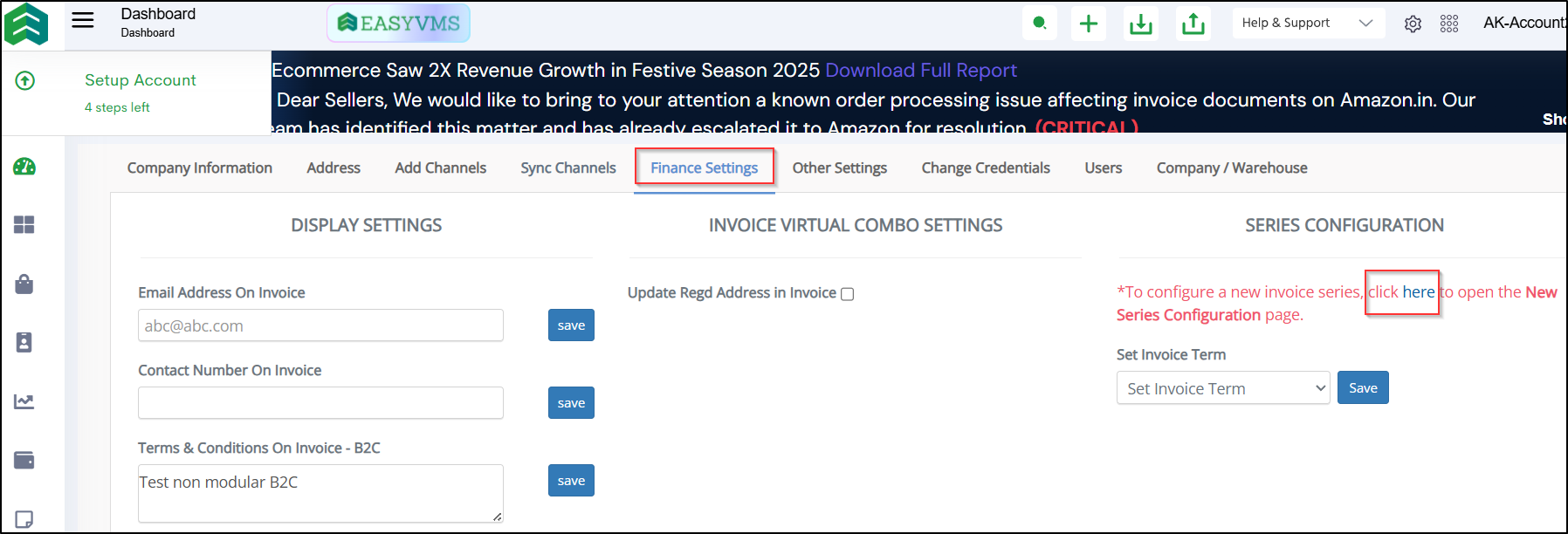 Steps to Set Invoice Series for B2C and B2B Orders Step 1: On the dashboard, click on the “Three dots aka meatball menu” Step 2: Click on the “Account Settings” option Once you click on the meatball menu, you will see the following fly-out menu: ...