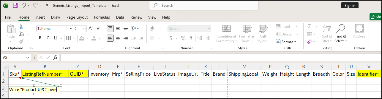 In the Import Listings excel file, enter your 'Product UPC' in SKU, Listing Reference Number, GUID, and Identifier columns.
