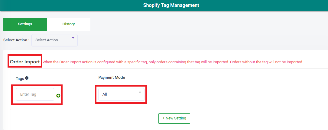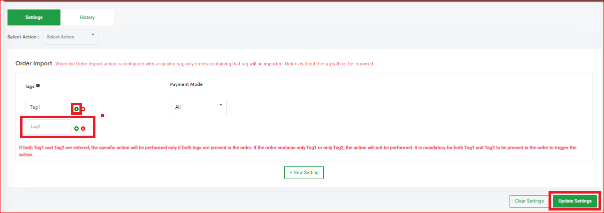 Order Import Action - Define the Tag and choose the Payment Mode (The payment mode is always selected as "ALL" by default, you may choose from COD or Prepaid if required) and click "Update Settings".