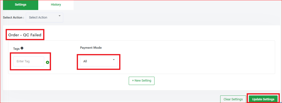 Order- QC Failed - Define the Tag and choose the Payment Mode (The payment mode is always selected as "ALL" by default, you may choose from COD or Prepaid if required) and click "Update Settings".