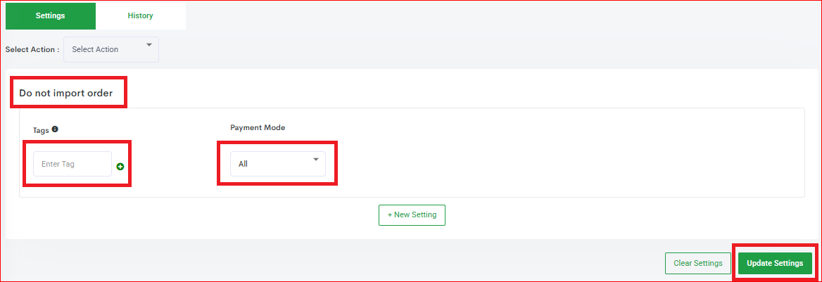 Do Not Import Order- Define the Tag and choose the Payment Mode (The payment mode is always selected as "ALL" by default, you may choose from COD or Prepaid if required) and click "Update Settings".