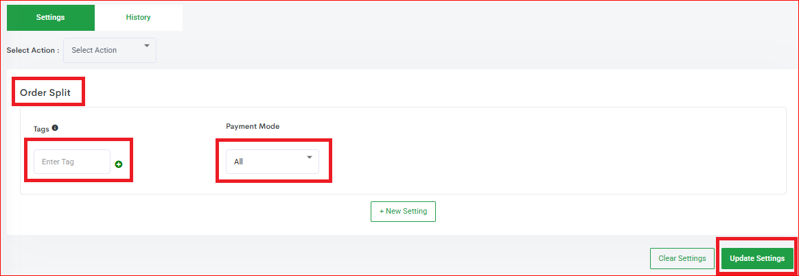 Do Not Split Order - Define the Tag and choose the Payment Mode (The payment mode is always selected as "ALL" by default, you may choose from COD or Prepaid if required) and click "Update Settings".