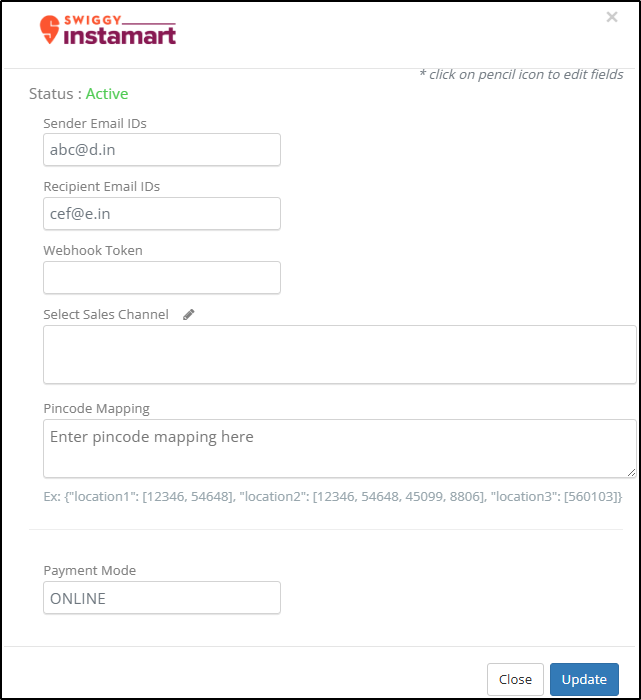 The combination of sender and recipient email IDs should be unique for each integrated quick commerce marketplace.